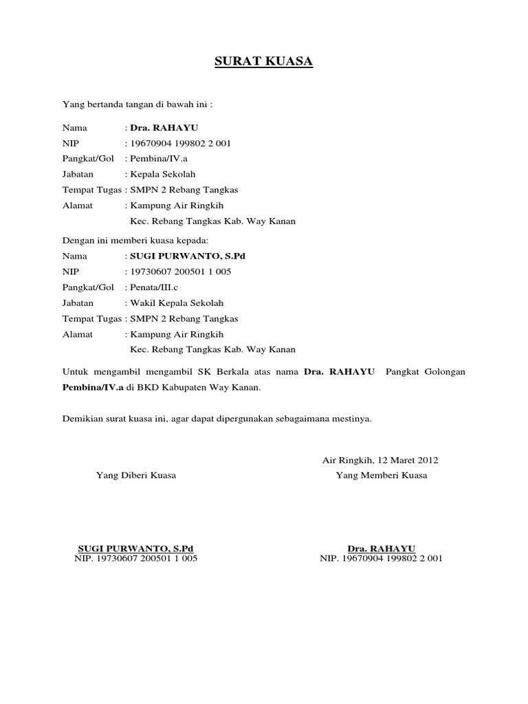 Pahami persyaratan membuat surat kuasa berdasarkan contoh surat kuasa di bawah ini. Yang akan menjadi materi pembahasan kita kali ini adalah mengenai contoh surat keterangan usaha (sku). Surat memohon kebenaran mengadakan program via www.scribd.com. Contoh surat wakil untuk ambik geran atau sebagainya. Apabila surat wakil ini dikemukan semasa membuat urusan, ia dijadikan sebagai bukti bahawa dokumen atau urusan tersebut telah dibuat oleh orang lain yang dibenarkan oleh pemilik sebenar dokumen tersebut.